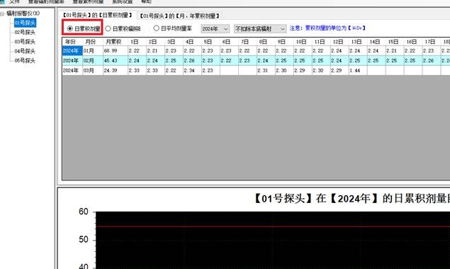 本软件最核心的功能?橛兴母觯翰榭醇亮柯、查看剂量率报警数据、查看日累积剂量和查看总累积剂量。软件通过曲线和棒状图的方式将探头的剂量率和累积剂量数据进行了充分展示。查看剂量率?槟芸10年的历史剂量率数据,并将每个探头一天86400条测量数据一次性加载成一条测量曲线,同时按不同报警模式加载报警阈值线,通过人眼比对,就很容易观察出仪器一天的辐射测量数据分布状况。查看辐射报警数据?榭梢园刺酵泛、报警类型和测量时间的关系查询出什么时候那个探头发生过辐射超阈值报警、探头掉线报警、机器故障报警、监测数据溢出报警等,同时也展现该天探头的全部测量数据分布。查看日累积剂量?槭嵌10年内每天的日累积剂量进行分析,以曲线或棒状图的形式展示该探头的日累积剂量、月累积剂量、年累积剂量、日平均剂量率、月平均剂量率、年平均剂量率分布。查看总累积剂量?橛美幢4嫣酵飞洗问萸辶愫笾两袼刍淖芾刍亮恳约白艿钠骄亮柯手。此外本软件还提供报警数据统计分析,通过三个不同的统计报表来为辐射仪器所发生的各类报警分析提供数据支持。